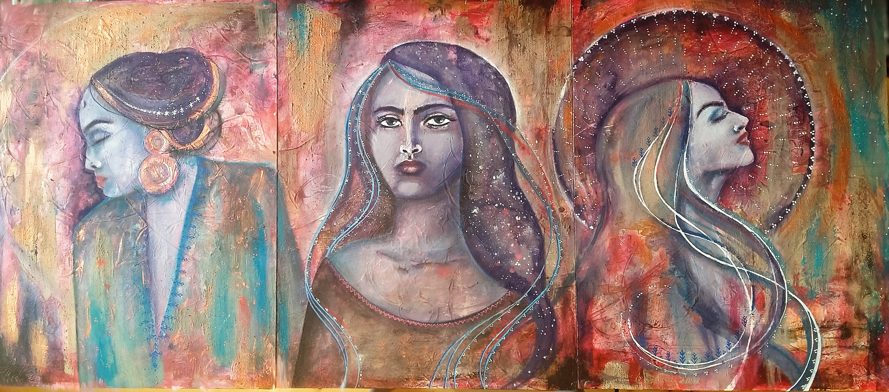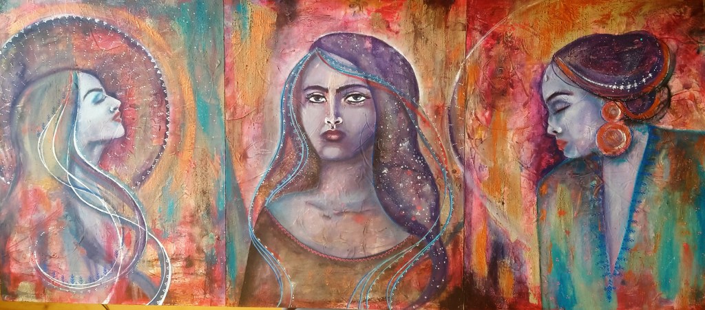 Original paintings available for sale, 333€ for the Triple Goddess triptych, on Simone’s online art shop (payment via PayPal, but you don’t need an account). Better individual pics coming when the light allows for it ;). The triptych is created so that each side portraits can be switched and still create only one painting.